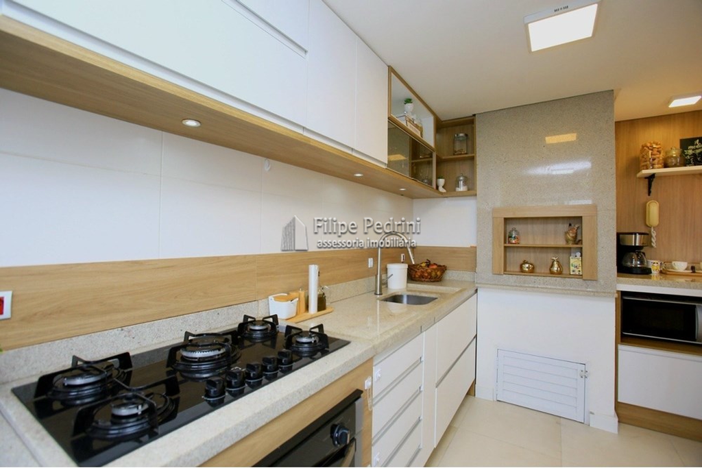 Cozinha americana com bancada em granito, churrasqueira também em granito e água quente na cozinha e banheiros; 2 dormitórios com suíte walking closet.