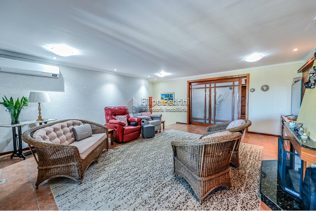 - Churrasqueira no espaço gourmet com uma vista única do Guaíba e sala de TV que complementa o ambiente acolhedor.